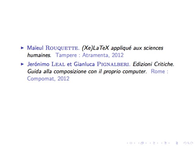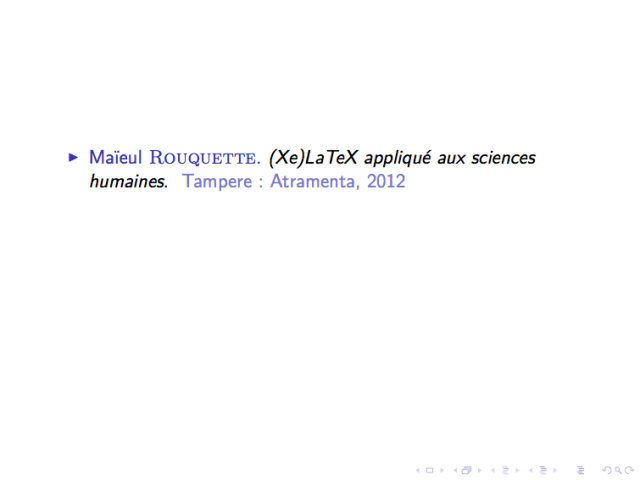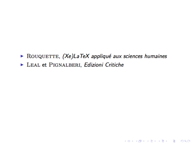 \end{document}Cela signifie que je souhaite que ma première diapositive affiche d’abord la référence de l’ouvrage de Rouquette [1], et ensuite celle de Léal, en deux étapes.