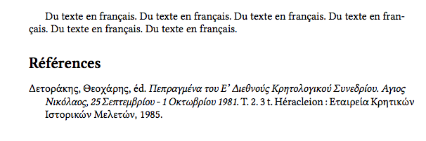 On constate que LaTeX n’est pas capable de faire une césure correcte sur "Κρητικών". Pourquoi ? parce qu’il utilise les césures de la langue principale du document, à savoir le français.
