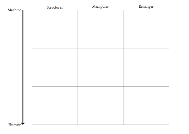 Mon exposé vise à présenter trois démarches de base de l’informatique : structurer les donner, les manipuler et les échanger. Ces démarches peuvent s’effectuer de manière plus ou moins proche de la machine. C’est pourquoi je distribue à mon auditoire le schéma ci-dessous, mon exposé traversant les différentes cases du tableau.