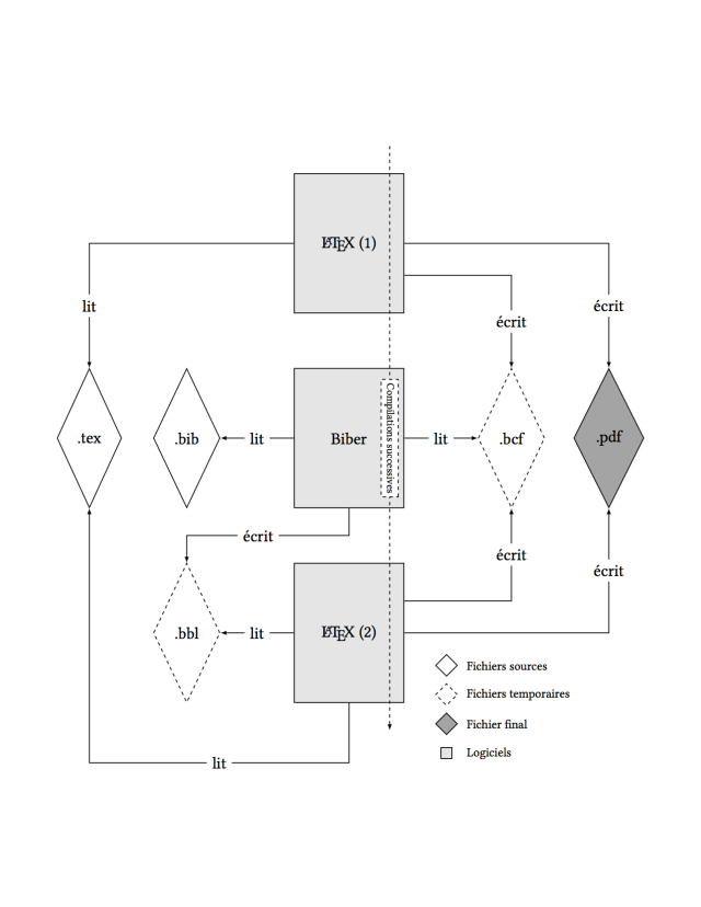 .tex, repère les citations à l’intérieur, et écrit dans un fichier.bcfles clefs de citations utilisées ainsi que certaines informations relatives au style bibliographique, dont les informations sur le tri de la bibliographie. - Lors de la compilation Biber, ce dernier lit le fichier