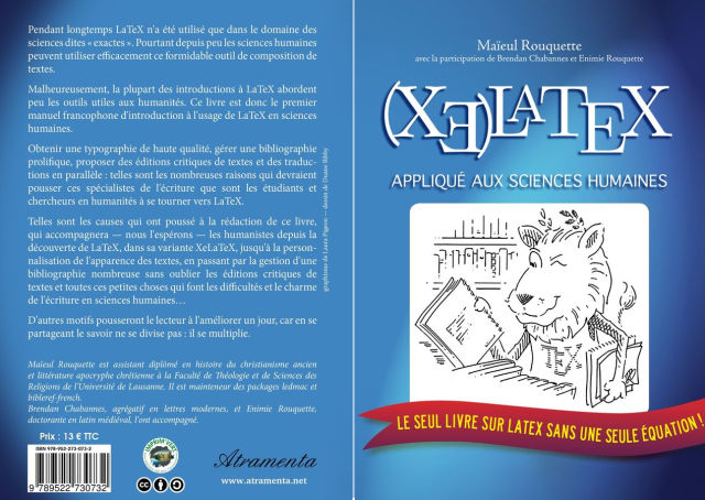 Telles sont les causes qui ont poussé à la rédaction de ce livre, qui accompagnera --- nous l’espérons --- les humanistes depuis la découverte de LaTeX, dans sa variante XeLaTeX, jusqu’à la personnalisation de l’apparence des textes, en passant par la gestion d’une bibliographie nombreuse sans oublier les éditions critiques de textes et toutes ces petites choses qui font les difficultés et le charme de l’écriture en sciences humaines…