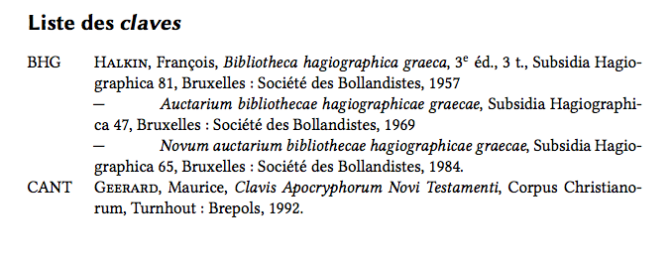Lorsqu’on cite des œuvres anciennes, par exemple dans le domaine du christianisme ancien, il peut être utile d’indiquer l’identifiant de celles-ci dans une ou plusieurs claves (singulier clavis), tel que la Bibliotheca hagiographica graeca (BHG) ou la Clavis apocryphorum novi testamenti (CANT), afin d’éviter les confusions entre œuvres homonymes, ou pour clarifier l’identification d’une œuvre publiée sous différents titres.